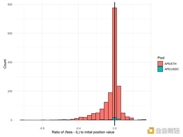 請注意,這并不意味著大多數流動性頭寸相對于其初始狀態虧損!相反,這意味著在Uniswap V3上ApeCoin交易的前24小時內,無常損失與費用的平衡往往有利于大多數流動性頭寸的無常損失。如果流動性提供者完全對沖(例如,通過外部交易所的永續期貨;假設資金費用可以忽略不計),這可以直觀地被認為是收益分布。