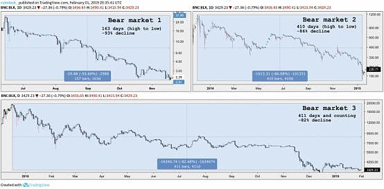 截至2月2日,比特幣的價格在過去411天中始終呈下降趨勢。這是比特幣十年歷史上最漫長的熊市。