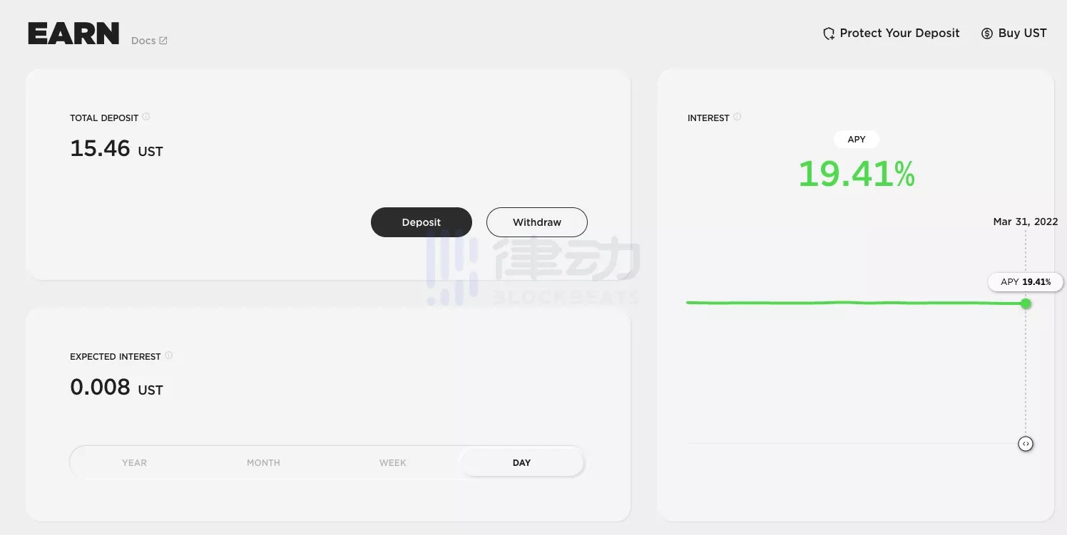 Anchor 最大也是唯一的成本,就是向存款人支付存款利息。這里我們以 3 月 31 日的數據為例進行計算,目前 Anchor 中 UST 的存款規模約為 120 億 UST,存款利率 19.4%,因此 Anchor 每日的成本支出約為 640 萬 UST。
