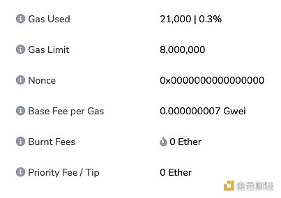 在這筆交易里,使用了21000gas,一共為0.0000168ETH,價格約為0.052美元。
