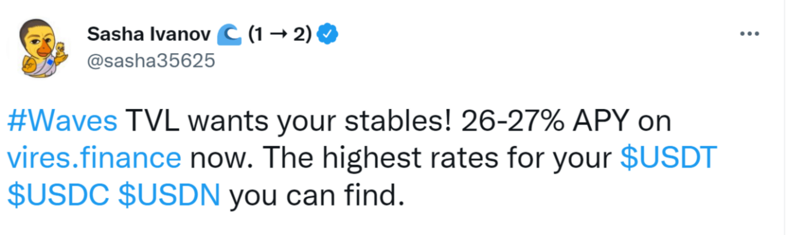 在之前 Waves 創始人曾發推文表示 Vires.finance 可提供 25% 以上的 APY,這也讓人們聯想到了 Terra 用 20% APY 吸引用戶的 Anchor,類似于 Terra 生態 —UST—Anchor Protocol ,Waves 也形成了 Waves 生態 —USDN—Vires Protocol 的資金流。
