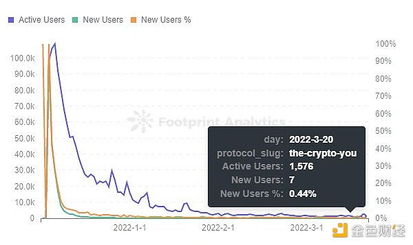 The Crypto You 目前用戶數量累計達到 4.8 萬名,但用戶留存,新用戶增長均式微。 12 月游戲上線,涌入 22 萬的用戶。但此后不斷下降,截至 3 月 20 日,3 月的新用戶僅有 166 個。雖然活躍用戶達到了 1,500+,但對于新項目如何吸引新用戶將項目盤活顯然更為重要。