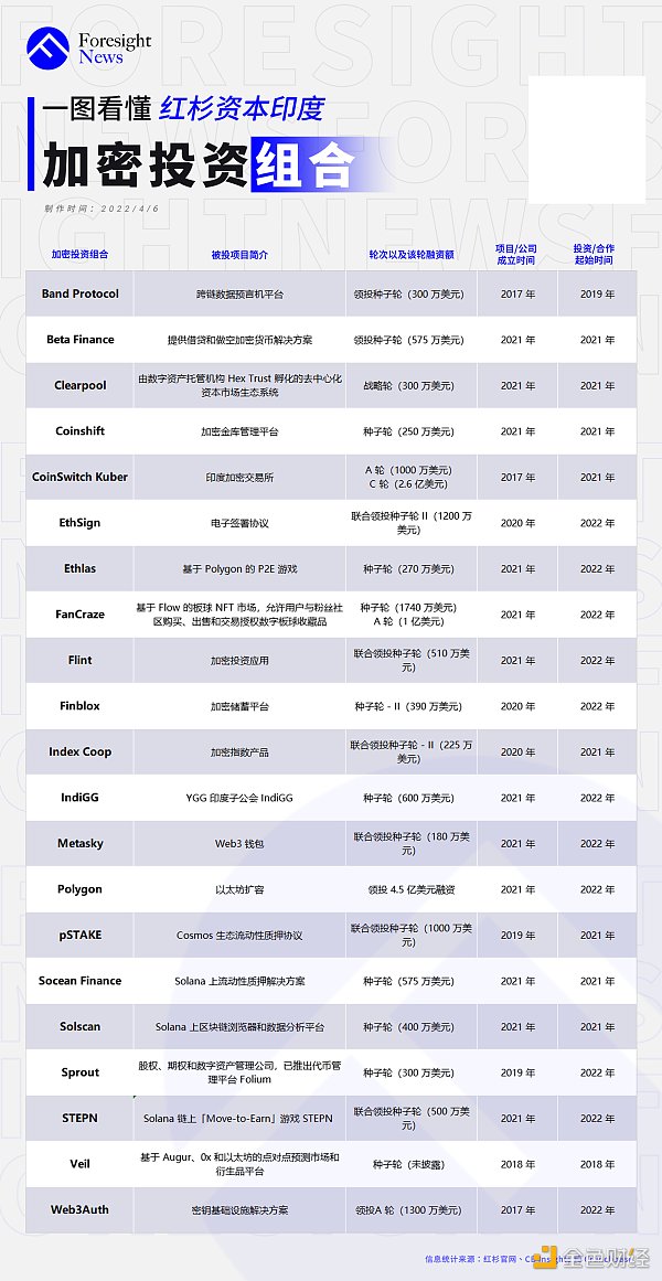 在這些投資中,紅杉資本印度對印度加密交易所 CoinSwitch Kuber 和基于 Flow 的板球 NFT 市場進行了兩輪投資,領投(或聯合領投)的項目包括Band Protocol、 Beta Finance、EthSign、Polygon、pSTAKE 以及 STEPN等。