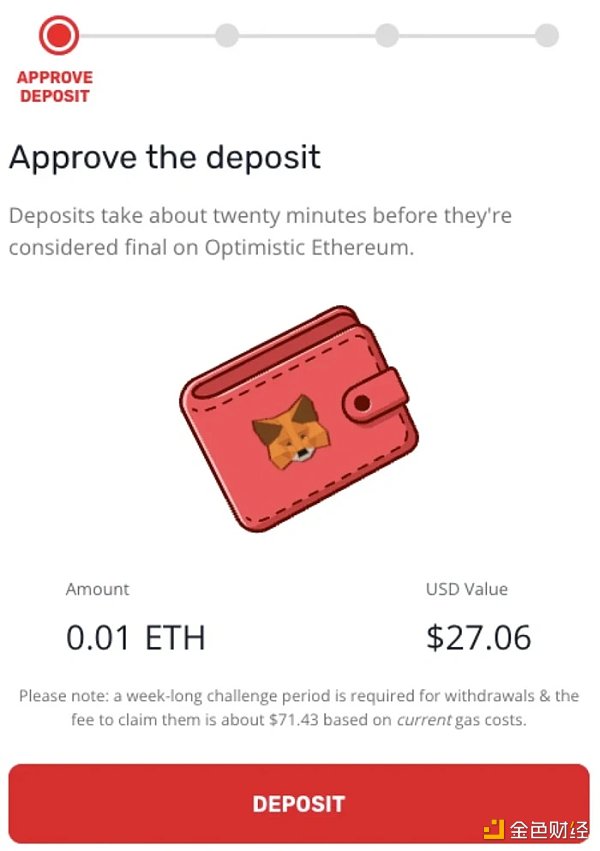 到這一步,你可以將任何 Layer 1 網絡上 ERC-20 代幣(或 ETH 本身)轉換到“橋上”,然后橋接技術會將你的 Token 移動到 Layer 2 網絡。以下圖為例,我們輸入了 0.01 ETH,即 27 美元,您將看到如下所示的屏幕: