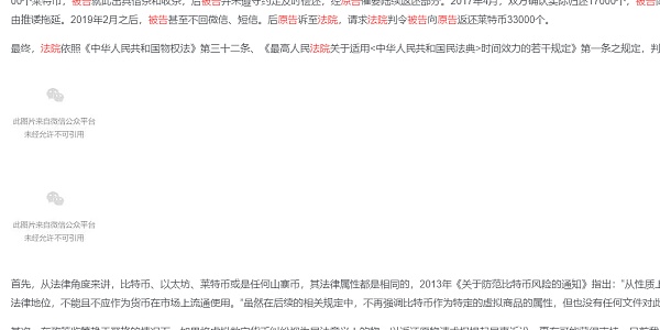 最終,法院依照《中華人民共和國物權法》第三十二條、《最高人民法院關于適用<中華人民共和國民法典>時間效力的若干規定》第一條之規定,判決被告于判決書生效后七日內返還原告萊特幣33000個。