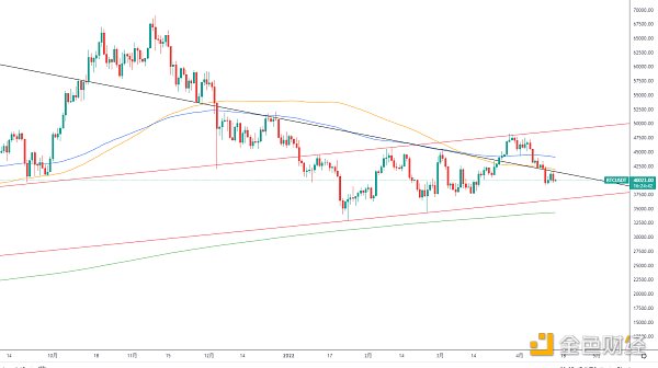 昨日BTC沖高回落,依舊在下降壓制線41500附近遇阻回落,突破才有望向上試探42500-43000壓力,上方還有多周期壓力帶44000-45000,日線短期支撐39000,有效跌破將有可能向下測試通道支撐37000,大方向偏空,反彈逢高減倉為主。