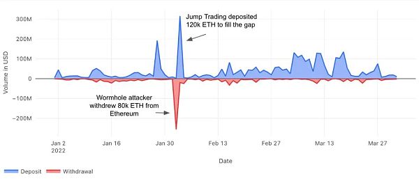 讓我們來看看以美元計算的存取款量的橋動態。下面的圖2顯示了2022年第一季度以美元計算的每日存取款量。我們認為,一些交易量的急劇上升是由事件驅動的(例如,啟動一個新項目、空投、激勵計劃、鯨魚活動、橋漏洞等)。