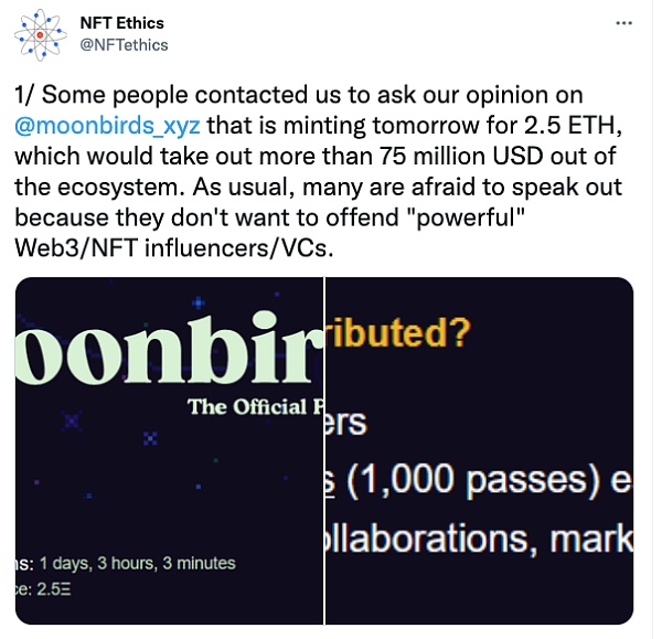 推特名為「NFT Ethics」的意見領袖曾發布過很多關于NFT和Web3行業的內幕,上周,它發布了多條推特質疑Moonbirds背后的團隊,先是暗指該NFT系列價格增長快速可能與Proof成員「清洗交易」有關,即有人在同一交易者控制的錢包之間來回出售NFT,以推高價格。