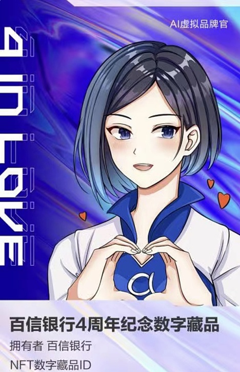 2021年11月18日,百信銀行發行了“4 in love”四周年紀念數字藏品,并同步推出AI 虛擬品牌官的二次元形象。該藏品在百度超級鏈上發行,具有唯一性和不可篡改性。這是銀行業首個數字藏品,也是百信銀行迎接元宇宙的一次嘗試。