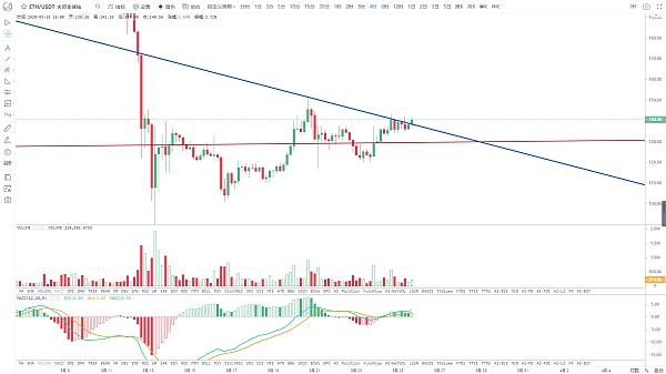 聯動上漲,目前價格已上穿前期支撐轉目前壓制線,不過量能依舊未能顯著放大,4小時MACD多頭量柱也未顯著增長,近期整體依然是區間波動行情,后面只有顯著增量,才有望向上試探前高152美金,同時也是20日均線壓制位,均線上5日線走平,中長期均線依舊保持向下,大方向趨勢依舊偏空,所以目前只能算是反彈,反轉還需要時間和空間進一步整理。
