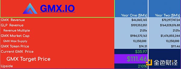 鑒于這些限制,GMX的上行空間仍然非常有利可圖。當前GMX價格為36美元,預計第1年價格(剩余約20周)為74.31 美元,上漲106%。