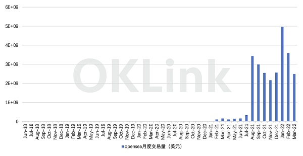 從目前交易量最大的OpenSea平臺的月度交易量可以看出,OpenSea在2022年1個月,創下月度近50億美元的交易額,超越去年8月34億美元的前高,月交易用戶數突破54萬人,同樣創歷史新高。