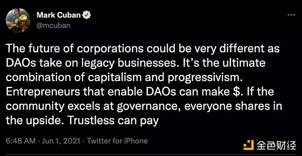 最近一些 DAO 開始吸引了傳統投資市場和加密 KOL 的注意,其中不乏億萬富翁馬克. 庫班,他稱 DAO 為資本主義和進步主義的終極結合。著名加密投資機構 A16Z 還專門領導和布局了對于 DAO 的投資金額,據披露達數百萬美元。