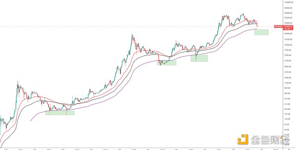 我們從圖一能看到一旦有效跌破黑線支撐,后面往往還有較大幅度調整,基本都要回落至紫線下方一般才會到達大底區域,2014年、2018年和2020年熊底區域都位于該線下方,所以BTC很可能下跌中繼,而目前BTC短期內持續下跌,偏離短期均線較遠,近期有反彈修復需求,反彈后將有再次下探可能,注意風險。
