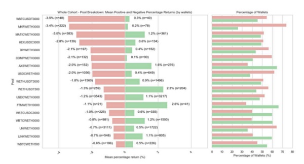 Topaz Blue 和 Bancor 協議于 2021 年 11 月發布了一份關于 Uniswap V3 收益的深入研究。該報告提供了關于手續費收入和無常損失的統計數據。令人驚訝的是,根據該報告,在此期間,Uniswap v3 上幾乎有一半的流動性提供商(LPs)因無常損失(ILs)而出現負收益。