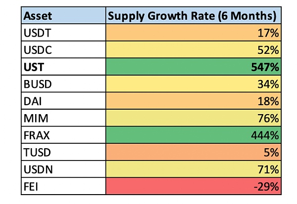 上圖:穩定幣 6 個月的增長率,來源:Coingecko & Bankless