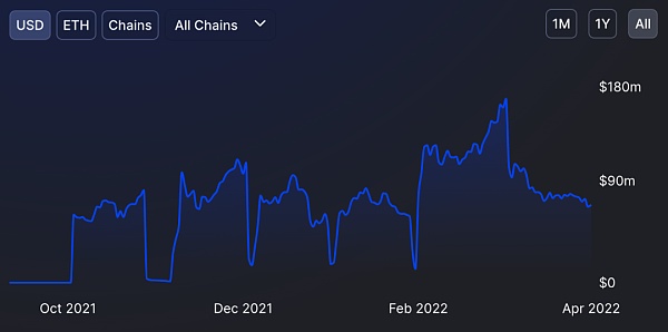 以太坊 DeFi 協議的 TVL (鎖倉總價值) 已經從 2021 年一季度的 491 億美元增長至 2022 年一季度的 895 億美元,漲幅達 82%。這個指標衡量了存儲在基于以太坊的 DeFi 協議 (比如去中心化交易所、貨幣市場和期權金庫等) 中的資產的價值。
