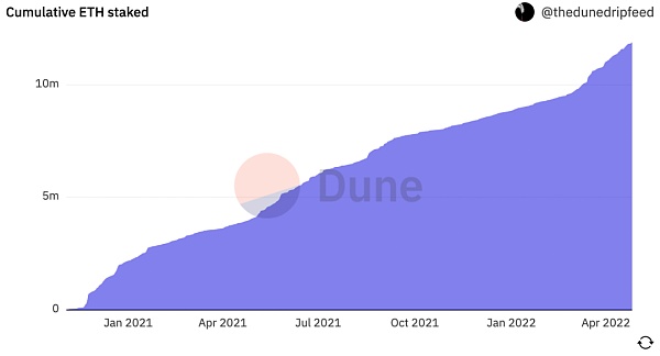 被質押的 ETH 總量從 2021 年一季度的 520 萬增長至 2022 年一季度的 1090 萬,漲幅達 111%。該指標衡量了在以太坊從使用工作量證明 (PoW) 共識機制過渡到權益證明 (PoS) 之前,在信標鏈 (Beacon Chain) 上押注的 ETH 數量。大約 9.2% 的總 ETH 供應量已經被押注在預期的“合并”中。