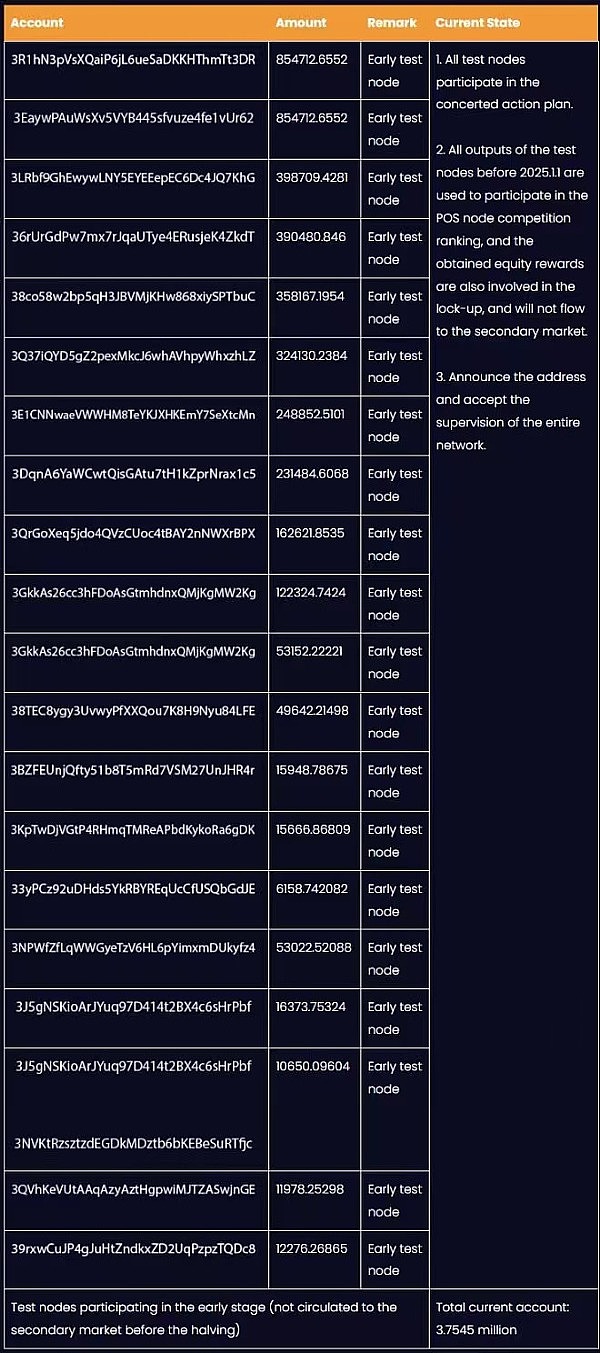 2,2025.1.1之前測試節點所有產出,用于參與POS節點競賽排名,所獲取的權益獎勵也一起參與鎖倉,不流向二級市場。