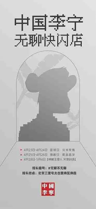 這張圖的中心是明顯的無聊猿的邊緣輪廓,再加上“中國李寧-無聊快閃店”的說法,自然讓大家紛紛猜測,李寧和無聊猿IP合作了?