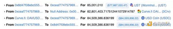 1、LFG 先是發布了一項聲明,將 1.5 億美元的 UST 流動性從 3CRV + UST 池中轉移出來,為 4pool 的推出做準備。同一時間,一個匿名地址橋接并拋售了 8500 萬美元的 UST。?