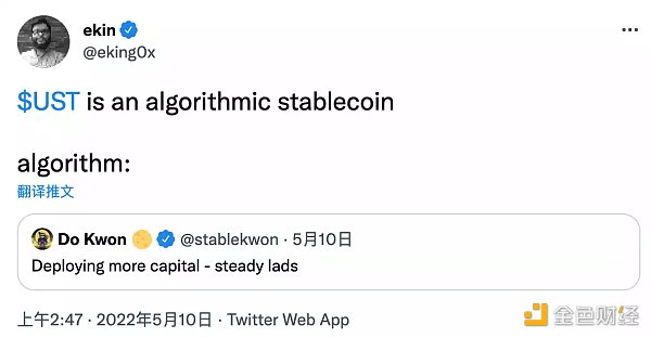 盡管如此,這樣的背景介紹并沒能打消許多人對 Terra 聯合創始人 Do Kwon 極其公開、實時地處理 UST 解體問題的疑慮。當 Kwon 在 Twitter 上直播支持 Terra 的 Luna Foundation Guard 貸款數十億美元以支撐 Stablecoin 的努力(最終沒有成功)時,一些人忍不住指出這一策略暴露出的?UST 作為「算法 Stablecoin」的荒謬之處。