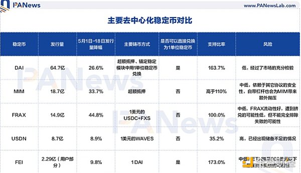 UST 暴雷之后,去中心化穩定幣受到全面重創,截至 5 月 18 日,DAI 和 FRAX 的流通量在本月分別下降 26.6%% 和 44.8%。UST 曾是最成功的去中心化穩定幣,某些去中心化穩定幣在機制上也部分參考了 UST,下面將對常用的去中心化穩定幣進行介紹,并分析其風險。