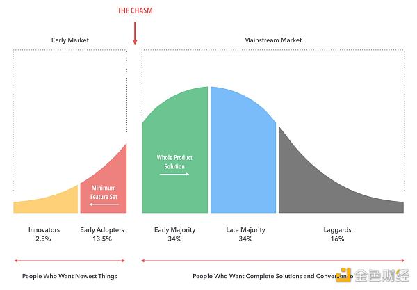 我們從用戶采用分布曲線 (也被稱為跨越鴻溝曲線) 可以看出,去年一年就有 12% 的人使用加密貨幣,這意味著我們處于「早期采用」區域的末端,即將面臨鴻溝。