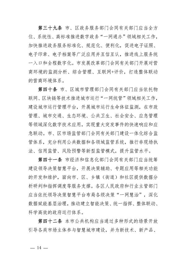 最后是數字化治理,《條例》指出,市、區城市管理部門會同有關部門應當依托物聯網、區塊鏈等技術推進城市運行“一網統管”領域相關工作,建設城市運行管理平臺,開展城市運行生命體征監測,在市政管理、城市交通、生態環境、公共衛生、社會安全、應急管理等領域深化數字技術應用,實現重大突發事件的快速響應和應急聯動。市、區市場監管部門會同有關部門建設一體化綜合監管體系,充分利用公共數據和各領域監管系統,推行非現場執法、信用監管、風險預警等新型監管模式,提升監管水平。