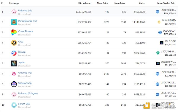 過去24小時去中心化交易所的交易量 數據來源:coingecko