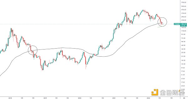 BTC月線自下方兩線高位死叉后便一路震蕩回落,前期2014年和2018年熊市也都是在兩線死叉后啟動,后面快線一直回落至水平線下方,BTC才最終到達大底區域,目前也有距離,并且兩線依舊保持下滑姿態,并未見止跌拐頭跡象。所以目前BTC可能還未見底,短壓32000-33000,空頭趨勢壓制35000-37000,有效突破才有趨勢反轉機會,在未突破前可以逢高減倉,謹防后續破位再次下殺。