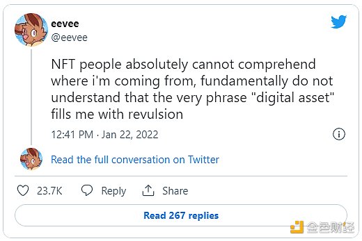 Web2 內容創造者 @eevee 最近的一條推文遵循了這一思路,并獲得了辯論雙方的廣泛的參與。對于了解針對 Web3 的批評,這則推文很有意思:
