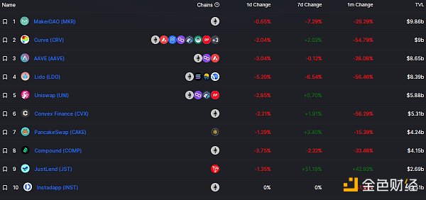 DeFi項目鎖定資產前十排名及鎖倉量 數據來源:defillama