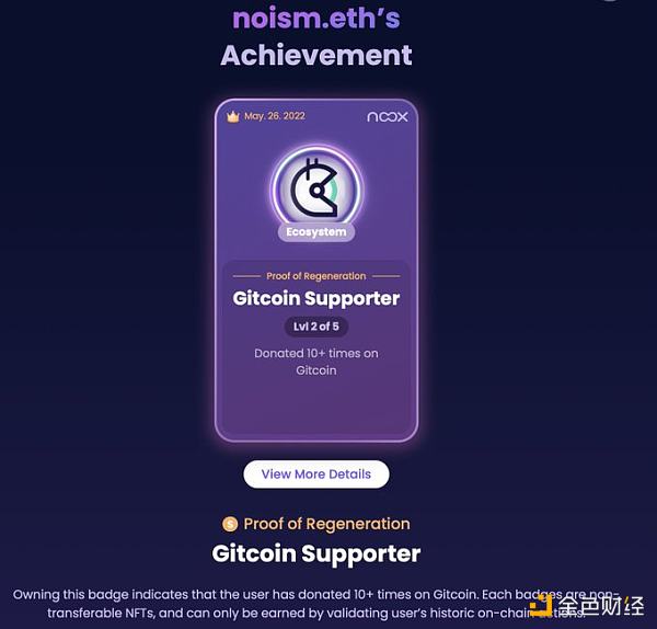 noox.world發布靈魂綁定NFT,代表你在鏈上所做的事情。這個徽章展示noism.eth在gitcoin上捐贈超過10次。
