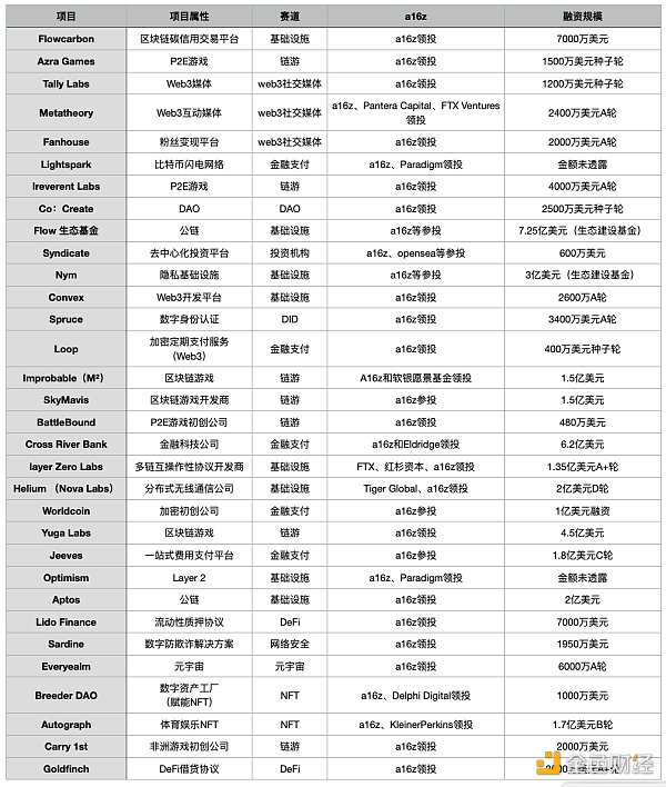 值得關注的是,a16z還同其他知名投資機構包括FTX、Paradigm、軟銀等共同領投了一下項目:如與FTX、Pantera共同領投web3互動媒體Metatheory、與Paradigm共同領投Lightspark、與軟銀共同領投鏈游M2、與Tiger GLobal共同領投分布式無線通信公司Helium、與FTX、紅杉資本共同領投LayerZeroLabs等。