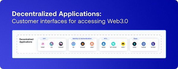 在 Web3 的上下文中,應用層涵蓋 DeFi、NFT、身份和認證、數據和分析以及許多其他令人興奮的 dApp 類別。總之,這些分散的 Web3 應用程序包括一些最大的本地 Web3 公司,如 OpenSea、Uniswap 和 Aave。