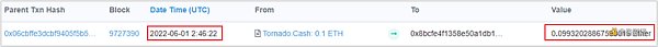 發起交易地址是0x8bcfe4f1358e50a1db10025d731c8b3b17f04dbb(簡記為0x8bcf),這也是黑客所持有的地址。同時,這筆交易也是0x8bcf發起的第一筆交易,資金來源于Tornado: