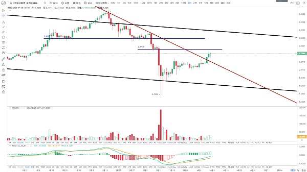 近期突破這段時間一直維持的震蕩區間箱體上沿阻力,而后出現快速上漲,并接連突破前期頂點5.5美金回落的下降趨勢線壓制,目前價格已漲至2.7美金上方,短線走勢也是相當強勢,中短期日均線順向多頭排列,對后續反彈構筑一系列支撐,指標上也顯示短線趨勢偏多頭,成交量跟上,繼續向上的概率大,上方短期壓力50日均線,同時也是前期大跌下跌中繼支撐區域,大致范圍2.9-3美金之間,一旦有效突破站穩,那么將會繼續上攻強壓區,這個位置是前期構筑的倒V形頂頸線支撐區,也是60日線壓制區域,至于價格能否到達,還需后面觀察,短線操作上可繼續沿5日線持幣,不破不出。