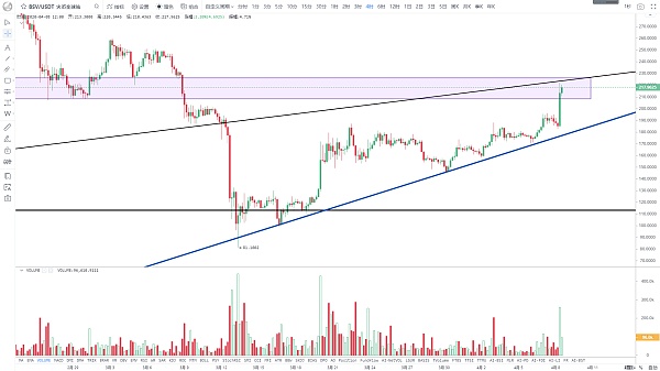 今日反彈之星BSV走勢相當強勢,早間價格從185美金直線拉漲至最高222美金在小幅回落,技術圖形上能發現,拉升高點已經接近年初減半行情啟動得第一階段起漲趨勢線附近,同時也是前期下跌中繼籌碼密集交易區,也是生命線60日均線壓制區域,這一區域形成共振壓力帶,這一帶的阻力還是很強的,若能繼續放量突破,量能跟上后面將會打開新的上漲空間,下一阻力將在250美金上方,目前4小時走勢可看出,一直依托上行趨勢線一路拉升,今日的反彈也是下探觸及該趨勢線開啟反彈的,短線操作上可關注這條趨勢支撐線,技術上只要不有效跌破,都不能判定上漲趨勢的終止,近期BSV也要進行獎勵減半,對近期價格的反彈也起到利好助推作用,當前關注這一壓力帶能否突破,短期支撐200美金。