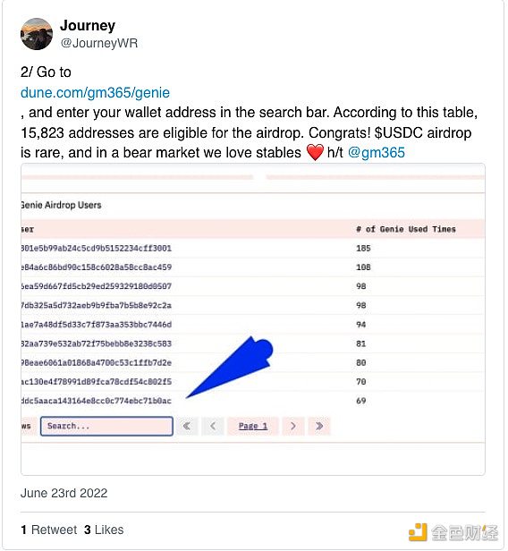 ? USDC的空投計劃讓很多人摸不著頭腦,因為穩定幣空投的方法在加密領域還沒有真正出現過。那么為什么是USDC?目前還沒有公開聲明,但我認為很可能是因為USDC在法律和邏輯上比目前的其他選擇更簡單。如果你想查看你的鏈上活動是否符合空投標準,請直接在下面Dune分析儀表板中搜索你想要的錢包地址。