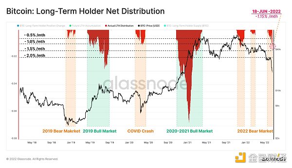 在最近的大幅下跌期間,LTH 投資者每月的支出略高于其供應量的 1%,這一比率與COVID崩盤和2021年12月歷史最高價之后的修正相吻合。這個水平幾乎是2018-2019年熊市最大流出量的2倍。