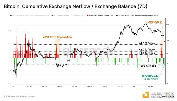 因此,盡管價格走勢嚴重下行,但本周交易所余額的凈余額消耗率僅為?2.8%。
