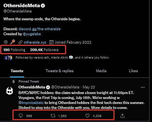 從粉絲數量來看,Otherside 的粉絲數量是 Goblins 的 11 倍。這意味著Otherside 比 Goblins 更受用戶歡迎和關注。