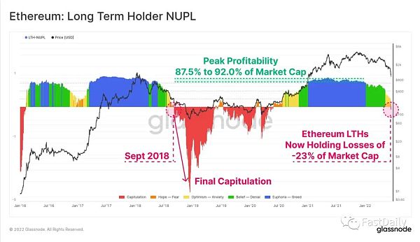 我們還可以調查以太坊長期持有者的未實現利潤和損失總額,長期持有者未實現的凈利潤/損失(LTH-NUPL)指標顯示,這一群體目前的盈利能力已經超過了收支平衡點,現在持有的未實現的損失相當于市值的23%。這意味著,即使是最強大的、持續時間最長的ETH投資者,現在的平均倉位也處于水下。上一次出現這種情況是在2018年9月,當時價格從230美元跌至84美元,下跌了64%,出現了更嚴重的拋售。