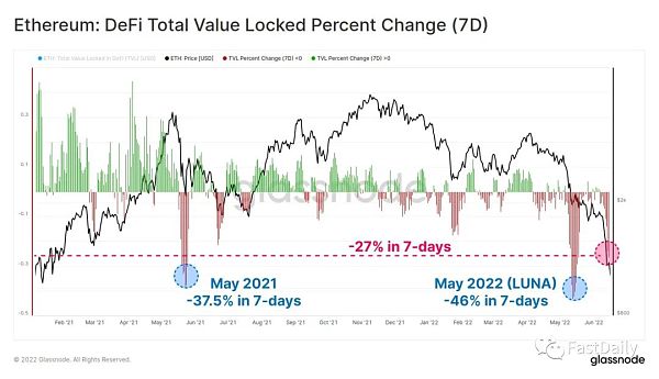 按7天計算,最近的這兩次TVL沖銷都是過去18個月中最重要的一些時間,最近的拋售促使TVL在一周內收縮了-27%的TVL。從這個指標來看,只有兩個更大規模的去杠桿化事件;第一個是與最近的LUNA崩潰相關的-46.0%,以及2021年5月從當時的ATH拋售期間的-37.5%。