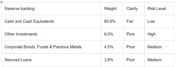 這三種穩定幣都以 1:1 的比例與美元掛鉤,Circle 和 Binance/Paxos 都要接受并公布月度審計,而 Tether 是季度報告。雖然 USDT 總是顯示其儲備,但它沒有提供關于審計的公開信息,這可能是投資者的擔憂。盡管在透明度報告方面存在差異,但這些穩定幣之間的儲備存在一些差異。我們在下面強調了這三個穩定幣之間的一些更多差異。