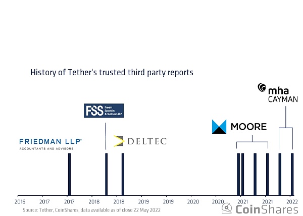 2017 年,隨著 USDT 儲備的壓力越來越大,Tether 邀請會計師事務所 Friedman LLP 進行儲備審計,但批評者強調,該研究有方法上的缺陷,并不代表完整的審計。在第一次審計后不久,Tether 公司報告說,Friedman 沒有在他們認為的 "合理時間內"完成審計工作,并終止了合作關系。然后,Tether 公司轉向了位于華盛頓的律師事務所 FSS。FSS 的報告不是對 Tether 的全面審計,但表示該律師事務所收到了 Tether 的兩家(未命名的)銀行的宣誓和公證的聲明。為了幫助建立信心,Tether 讓位于巴哈馬的銀行 Deltec 發布了一份報告,確認 Tether 在他們那里的賬戶中的現金數額,但這同樣沒有提供完整的情況,因為這只是來自其一家銀行的現金價值。2021 年,紐約總檢察長辦公室完成了一項調查,指出 Tether 夸大了其儲備,并隱藏了大約 8.5 億美元的損失。這導致了 1850 萬美元的罰款,并被要求在兩年內公布其持有的季度報告。大約在同一時間,Tether 宣布與開曼群島的會計公司 Moore Cayman 合作。Moore 提供了保證報告,證明了 USDT 的完全支撐,后來又提供了更詳細的儲備金細分報告。然而,自 2022 年 1 月起,MHA MacIntyre Hudson 表示,其開曼群島分公司 MHA Cayman 將處理 Moore Cayman 的客戶。應該注意的是,MHA MacIntyre Hudson 目前正在接受英國財務報告委員會的調查,因為之前對一家無關的公司進行了審計。? ? ? ?