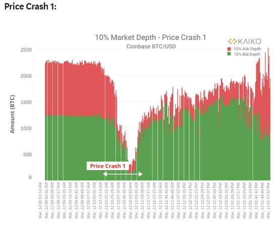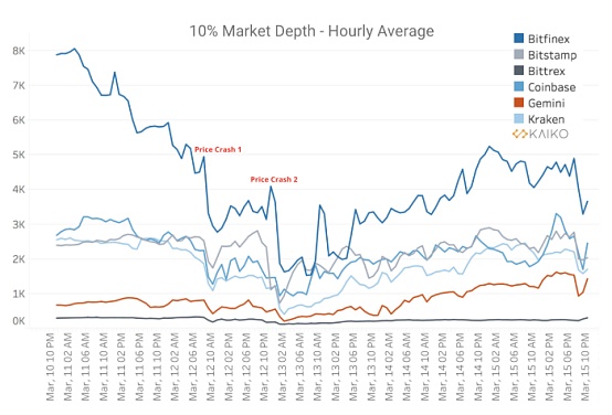 我們繪制了6個交易所的平均每小時10%買入/賣出價的深度,來自Coinbase,Bitfinex,Bitstamp,Bittrex,Gemini和Kraken。圖中第一次崩潰和第二次崩潰被標記了出來,以顯示平均深度在3月12日至3月13日之間是是如何急劇下降的。