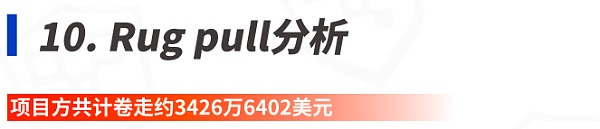 Rug pull通常指的是開發人員撤出 DEX 流動性池或突然放棄一個項目,毫無征兆地就卷走投資者的資金,通俗來講就是“跑路”。2022年第二季度,共監測到鏈上主要Rug pull事件43起,項目方共計卷走約3426萬6402美元。