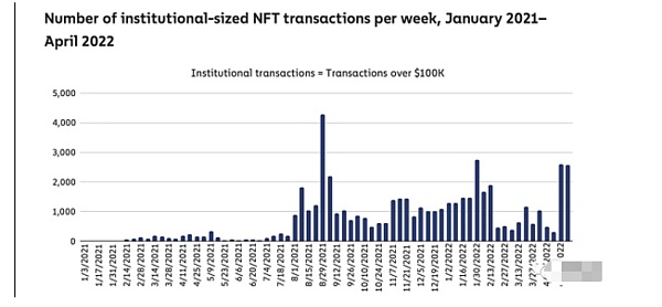 機構所做的與NFT有關的交易數量很少。就交易頻率而言,似乎90%以上的交易資產價值低于1萬美元。這是否意味著機構和交易者并不重要?不是的。處理價值1萬至10萬美元資產的交易者和機構(交易額超過10萬美元的交易者)約占交易量的 90%。